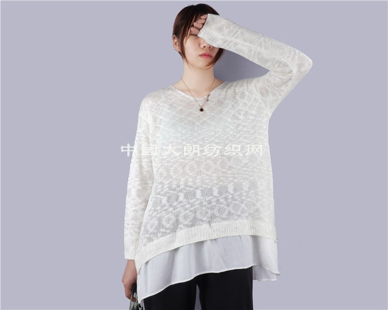 针织拼接雪纺不规则荷叶摆毛衣